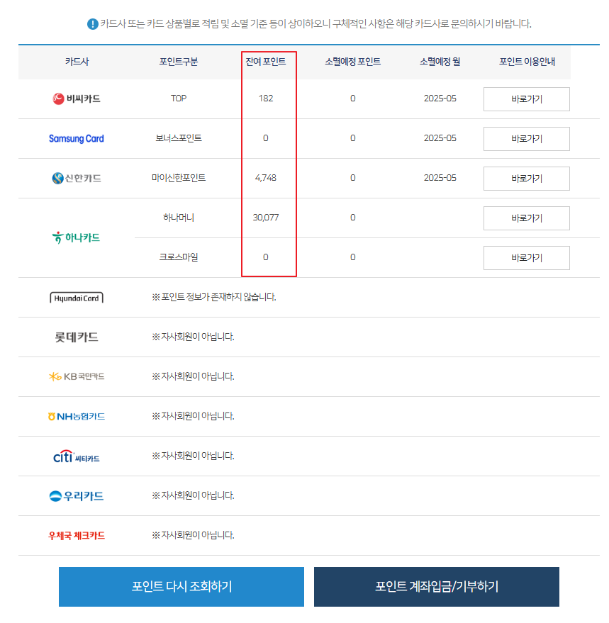 가장 쉽고 빠른 방법은 카드포인트 통합조회 서비스입니다.