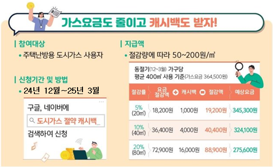 - 도시가스 사용량을 지난해 같은 기간 대비 일정 비율 이상 절감하면 캐시백이 지급됩니다.